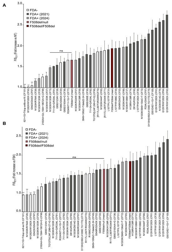 In contrast, the following severe FDA− variants were confirmed to be non-rescuable by ETI in the FIS assay (Figure 1, first genotypes on the very left side of the graph): W1282X, 621+1G>T, dup ex6-ex16, R764X, G542X, 2183AA>G, and c.1584+18672A>G.