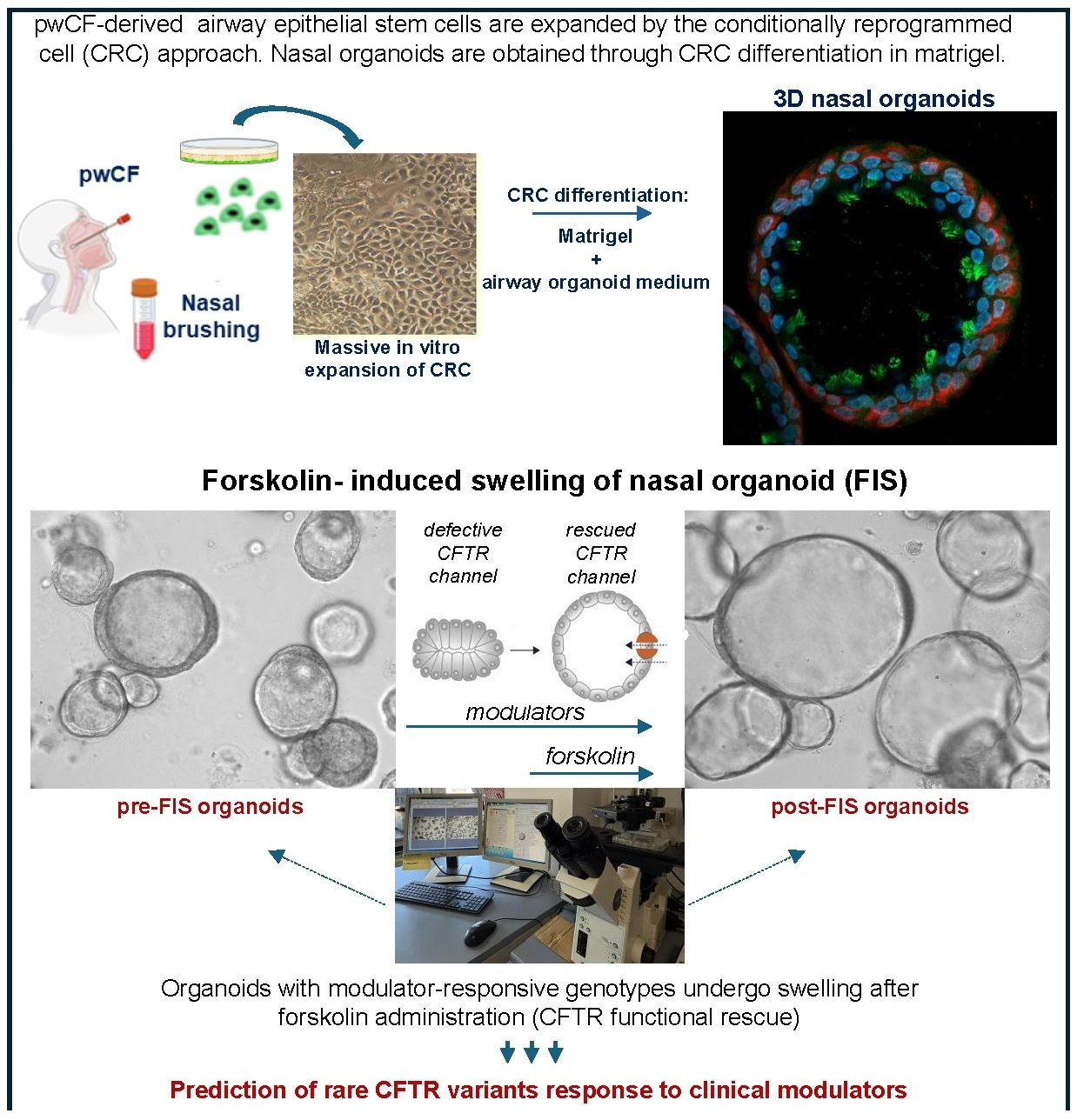 Here we focused on pwCF-derived nasal epithelial organoids obtained from nasal conditionally reprogrammed cells (CRCs) tested through the forskolin-induced swelling (FIS) of organoids. We fully characterized the model, optimized and standardized the FIS assay, and tested 38 rare CFTR pathogenic genotypes for their response to modulators, with particular focus on the triple combination (ETI).