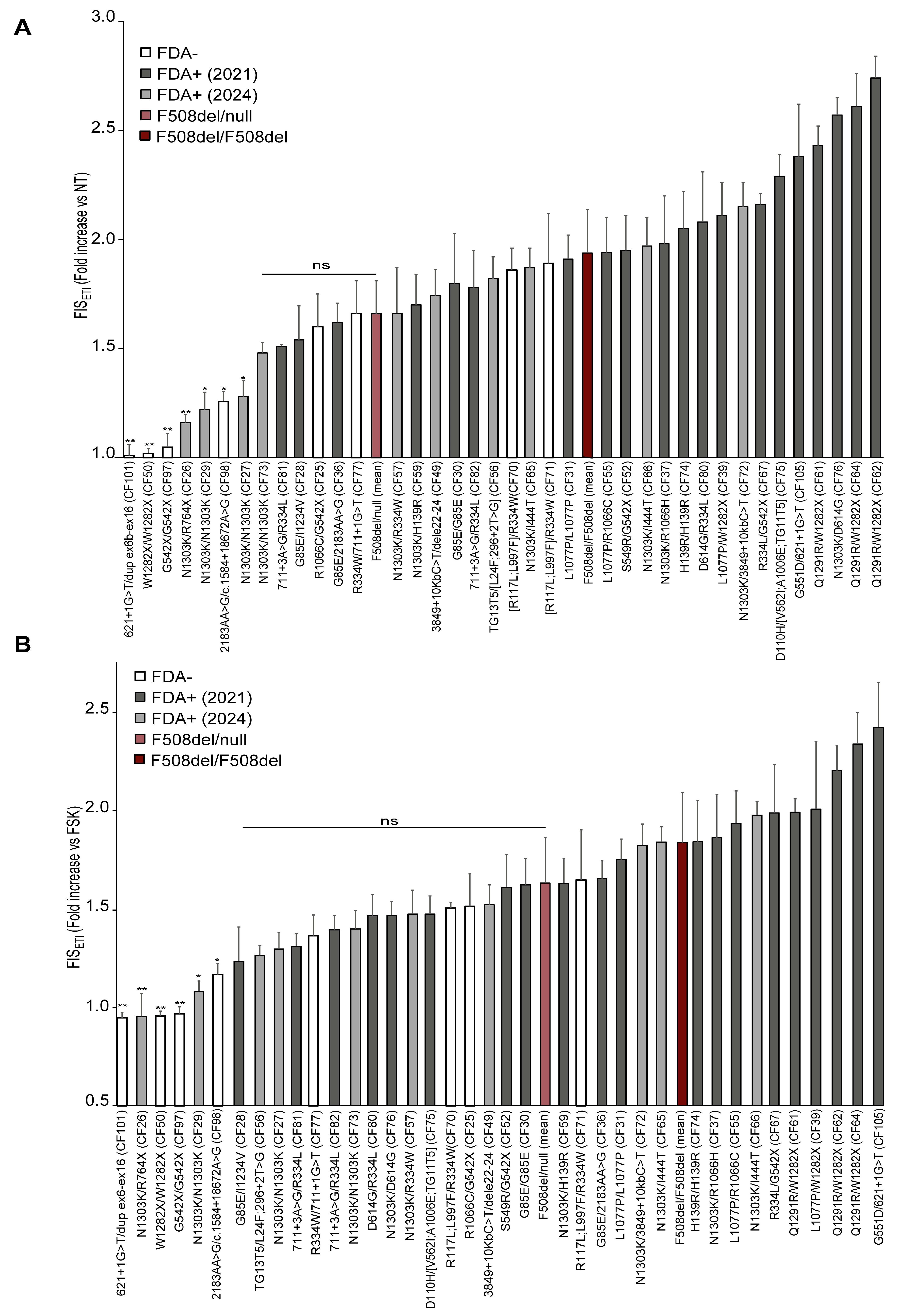 Figure 1B). Thus, we found generally similar genotype responses, and correspondence with the ETI approval was maintained, except for sample CF27 (N1303K/N1303K), possibly because its FIS