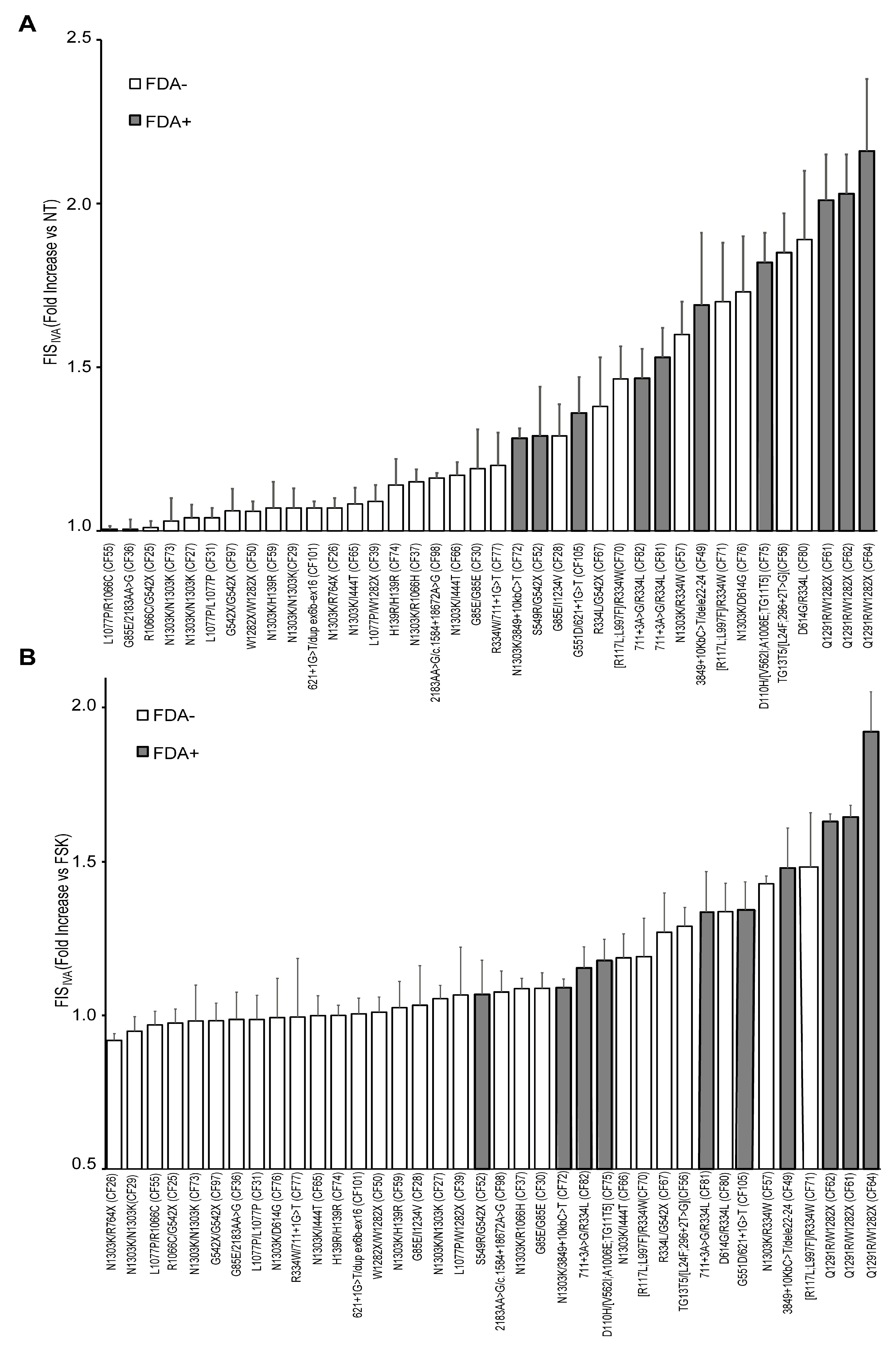 Figure 2. All FDA+ genotypes displayed a response to ivacaftor, although at variable extents, ranging from moderate to very high values. Some genotypes displayed very high FIS
