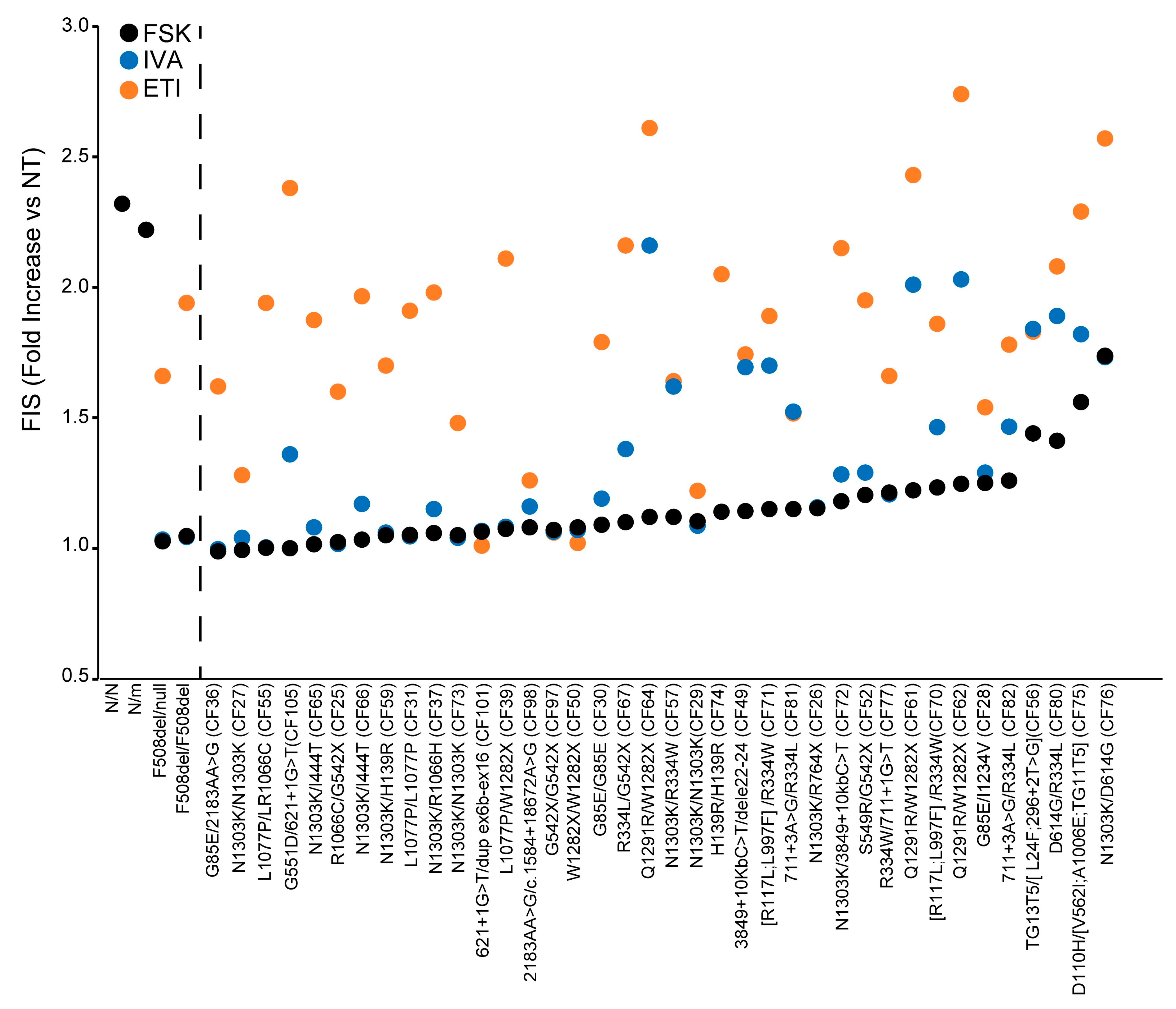 Figure 3, where samples are distributed based on increasing values of FIS in the absence of modulators (increasing extent of residual function), and can clarify the efficacy and the requirement of each drug/drug combination to achieve a clinical-grade response. Some genotypes showed a marked FIS