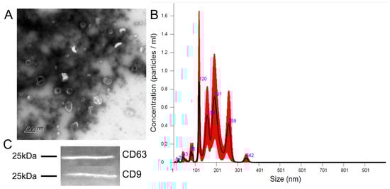 Extracellular vesicle concentration was analysed using a Nanosight LM10 HS instrument (NanoSight Ltd., Amesbury, UK) to determine particle size and number. A 2 μL aliquot of the extracellular vesicle suspension was diluted with a phosphate buffer solution (PanEco, Moscow, Russia) to a total sample volume of 2 mL (1:1000). Samples were injected into the instrument using a sterile 5 mL syringe. The recording and subsequent analysis settings were set manually according to the protocol (camera level 13, shutter speed 1232, shutter gain 219, particle detection threshold 8). Recording was performed at room temperature. Extracellular vesicles were visualised using laser light scattering, and their Brownian motion was recorded on video. Video recordings were processed using Nanoparticle Tracking Analysis software version 3.3 (NanoSight Ltd., Amesbury, UK). At least five separate videos were recorded and processed for each sample, each 60 s long. Data from multiple videos were combined to create a particle size histogram.