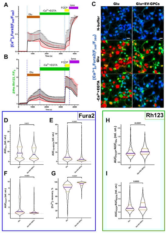The addition of glutamate (Glu) at a concentration of 100 μM (15 min) significantly increased the cytoplasmic calcium level [Ca2+]i and simultaneously caused a decrease in Ψm in all cells (619 cells for glutamate group (Glu), 621 cells for group with glutamate and EV-GPC addition) (Figure 6A,B). Figure 6C shows ratiometric fluorescence images of a Fura2-loaded cortical neuron culture demonstrating changes in Ca2+ levels after glutamate exposure and glutamate removal by buffer exchange with a calcium-free buffer containing EGTA (warmer colour corresponds to higher [Ca2+]i levels). To evaluate the intracellular changes in the studied groups, various parameters were analysed as previously described [71]. Briefly, the value of changes in [Ca2+]i and Ψm in individual cells was assessed by the change in the area under the curve (AUC) of fluorescence of the corresponding Fura2 and Rh123 dyes.