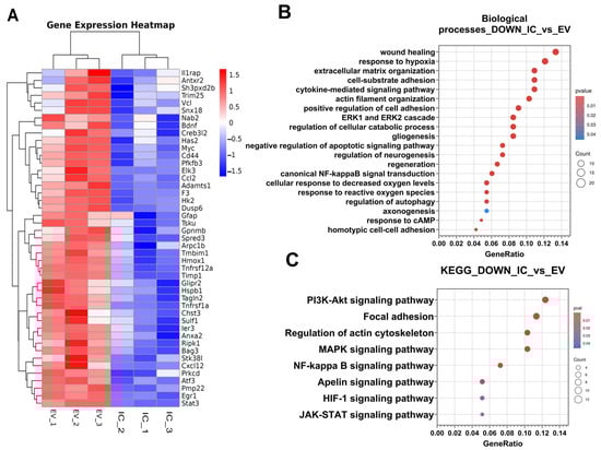 To investigate the changes in the gene expression profile of the neuroglia culture after addition of EV-GPCs, mRNA sequencing analysis was performed. In the IC_vs._EV comparison group, 52 differentially expressed genes (DEGs) were significantly up-regulated, while 181 DEGs were significantly down-regulated (p < 0.05 and |FC| < 1.5). The complete lists of DEGs, results of clustering (Supplementary Materials Figure S1), and the heatmap (Supplementary Materials Figure S2) can be found in Supplementary Materials. The volcano plot (Supplementary Materials Figure S3) demonstrates the differences in differential gene expression between groups and illustrates the molecular changes induced by the addition of EV-GPCs. The most striking DEGs are shown in Heatmap 8A.