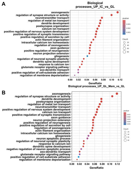 DEG analysis in the IC_vs._GL comparison group revealed that 969 genes were significantly up-regulated, while 300 genes were significantly down-regulated (p-value < 0.05 and |FC| > 1.5). In the GL_Mem_vs._GL comparison group, 797 genes were identified as significantly up-regulated and 300 as down-regulated (p-value < 0.05 and |FC| > 1.5). No significantly differentially expressed genes were detected in the IC_vs._GL_Mem comparison group. Complete lists of DEGs and results of clustering (Supplementary Materials Figure S5) and corresponding heatmaps (Supplementary Materials Figures S6 and S7) are provided in Supplementary Materials. The volcano plots presented in Supplementary Materials Figure S8A,B illustrate the differences in gene expression between the groups, highlighting the distinct molecular alterations induced by glutamate and memantine treatment.