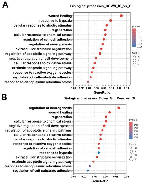 Analysis of differentially expressed genes (DEGs) using the Gene Ontology (GO) Biological Process database revealed a significant enrichment of down-regulated DEGs in key biological pathways. Supplementary Materials Table S1 presents the most significant DEGs belonging to the selected biological pathways (Supplementary Materials Table S1). The process categories containing the highest number of DEGs were wound healing, response to hypoxia, and the cytokine-mediated signalling pathway (Figure 8B).