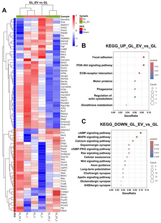 Transcriptomic profiling of neuroglial cultures following EV-GPC treatment. (A)—heatmaps of differentially expressed genes (DEGs) were obtained using pheatmap R package (version 4.5.2). Each row represents a gene and each column corresponds to an individual sample, sample groups indicated by column annotations. Log2-transformed gene expression values were row-scaled; hierarchical clustering was performed for both rows (genes) and columns (samples) using Euclidean distance and the complete clustering method. The colour scale represents scaled expression values and ranges from blue (down-regulated) to red (up-regulated); (B)—results of classification of down-regulated DEGs using the Gene Ontology Biological Processes database. The X-axis shows the ratio of pathway DEGs to the total number of DEGs, and the Y-axis shows the selected biological processes; (C)—results of classification of down-regulated DEGs using the KEGG database. The X-axis shows the ratio of pathway DEGs to the total number of DEGs, and the Y-axis shows the selected signalling pathways.