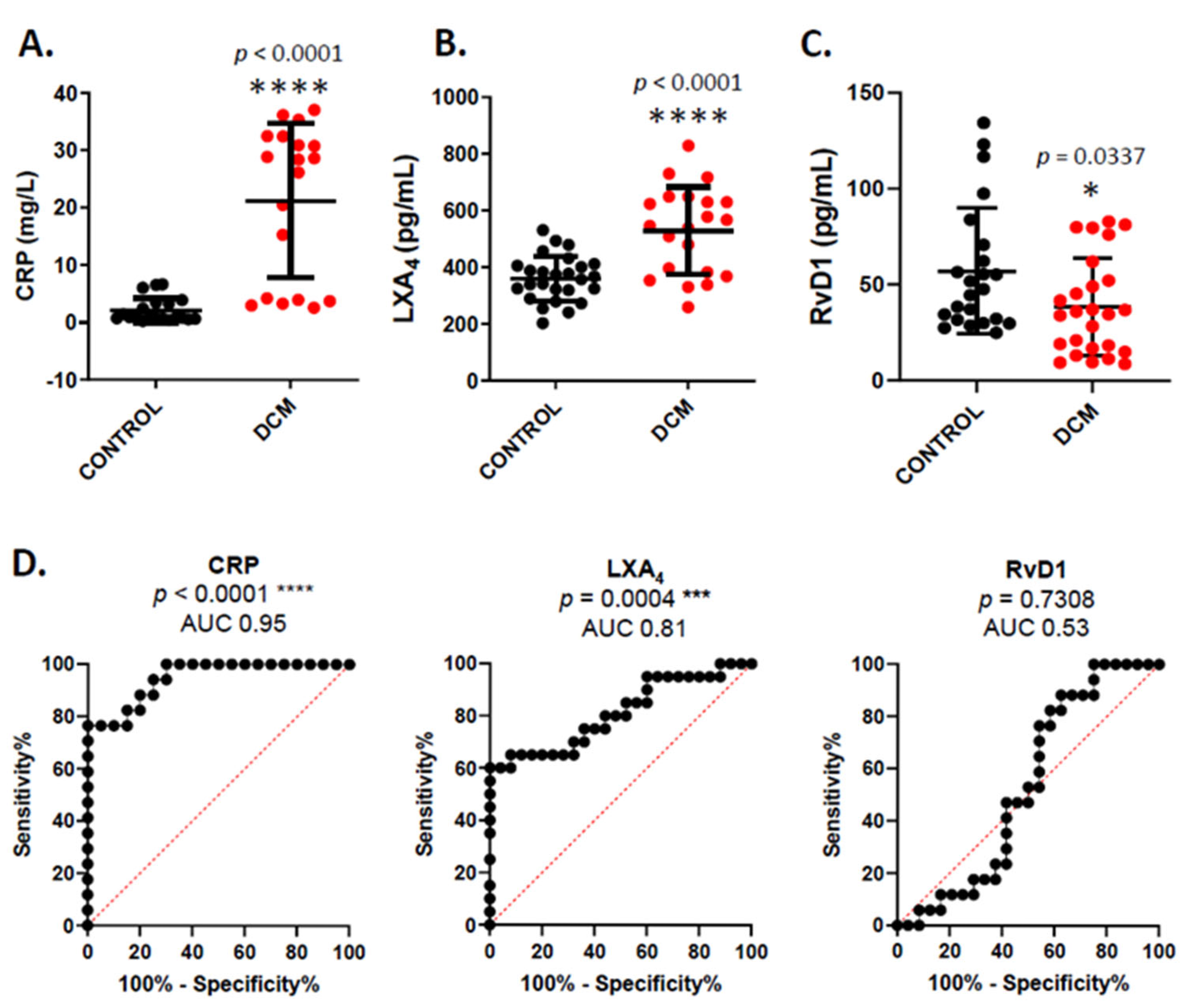 - Wang, Y.; Zhu, X.; Hu, Z. Decreased plasma lipoxin A4, resolvin D1, protectin D1 are correlated with the complexity and prognosis of coronary heart disease: A retrospective cohort study. Prostaglandins Other Lipid Mediat. 2025, 178, 106990. [Google Scholar] [CrossRef] [PubMed]