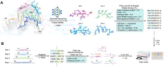 Dual design strategies for peptide inhibitors targeting conserved structural motifs of α-synuclein amyloid fibrils. (A). Structure-based design. Conserved binding sites (Sites 1–4) on the α-synuclein fibril architecture were identified as potential capping positions to interfere with fibril elongation. ProteinMPNN was employed to generate diverse candidate peptide sequences, which were subsequently filtered and ranked using AlphaFold2 (AF2) and Rosetta to assess binding compatibility and structural stability. (B). Sequence-based design. Conserved fibril segments were used as seed motifs to drive peptide generation via PepMLM, a sequence-based generative language model. The resulting candidates were screened using AlphaFold-Multimer to predict their binding modes with fibril segments. Shortlisted peptides from both design strategies were subjected to in vitro functional assays using a plate reader to evaluate inhibitory efficacy. Colors in the figure indicate the four conserved binding sites on the α-synuclein fibril (Site 1: pink, Site 2: green, Site 3: cyan, Site 4: blue).