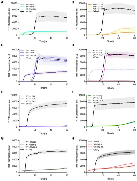 Inhibition of α-synuclein fibril formation by designed linear peptides T1–T4 and S1–S4. Thioflavin T (ThT) fluorescence assays showing the aggregation kinetics of α-synuclein monomers in the presence of designed linear peptide inhibitors. (A–D) Correspond to T1–T4 peptides; (E–H) correspond to S1–S4 peptides. α-Synuclein monomers (70 µM) were incubated alone (black) or with each peptide at molar ratios of 1:0.5, 1:1, and 1:2 (monomer–peptide). ThT fluorescence was monitored over 60 h to assess amyloid fibril formation. All peptides exhibited inhibitory effects on α-synuclein aggregation to varying degrees, reflected by reduced fluorescence intensity and prolonged lag phases compared to WT-only controls. Data are presented as mean ± s.d. from three independent replicates.
