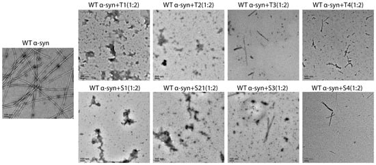 Representative TEM images illustrating the morphological effects of designed peptide inhibitors on α-synuclein fibrillation. Representative negative-stain micrographs illustrate the morphological outcomes of α-syn aggregation in the absence or presence of peptide inhibitors. Untreated WT α-syn formed abundant long, well-defined fibrils. T1 and S1 produced the strongest inhibitory effects, with mature fibrils nearly absent and predominantly amorphous or small granular aggregates observed. T2 and S2 induced partial inhibition, yielding reduced fibril numbers and shorter fragments. T3, T4, S3, and S4 showed comparatively weaker effects, with short fibrils and partially disassembled intermediates remaining. Scale bar: 100 nm.