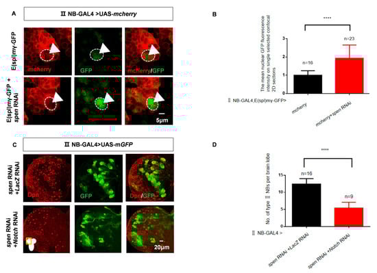 Type II NBs are more sensitive to the Notch pathway [6], and activation of the Notch signaling pathway leads to an excessive number of type II NBs [19,20,21,22]. In addition, we found that the time point at which Notch activation exerted its effects was nearly identical to the time point at which spen knockdown exerted its effects (Figure 1I,J). Therefore, we wanted to know whether the maintenance of type II NBs by Spen was associated with Notch signaling. Firstly, we measured the expression level of downstream genes -Notch activity reporter E(spl)mγ-GFP [47] after spen knockdown. We found an increase in E(spl)mγ-GFP content in a single type II NB (Figure 3A,B). Next, we performed a double knockdown of spen and Notch in type II NBs. This resulted in a rescue of the type II NBs number compared to spen knockdown alone (Figure 3C,D). The above experimental results indicate that Spen affects the development of type II NBs through repressing the Notch signaling pathway.