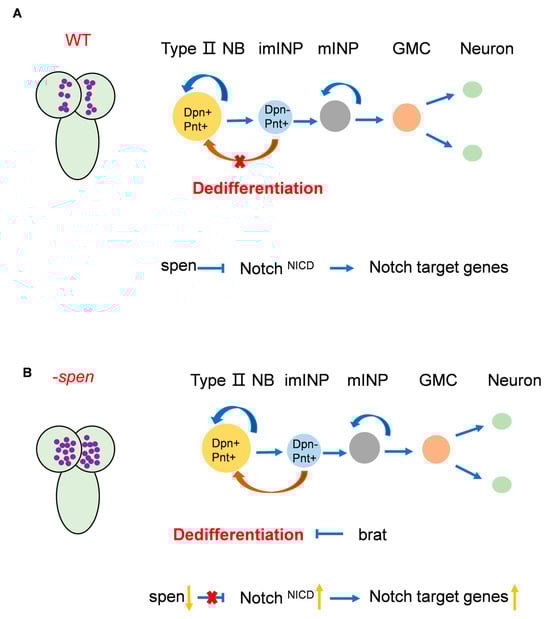 Pattern diagram of the role of Spen in type II NBs. (A) In wildtype, Spen may act as a co-repressor to regulate nuclear NICD levels, thereby repressing the expression of genes downstream of the Notch signaling pathway. So that the number of type II NBs can be maintained at normal levels. (B) In the absence of Spen, the level of nuclear NICD is elevated, resulting in increased expression of Notch signaling pathway genes. Then imINPs dedifferentiate into type II NBs to increase the number of type II NBs. Brat can inhibit this dedifferentiation.