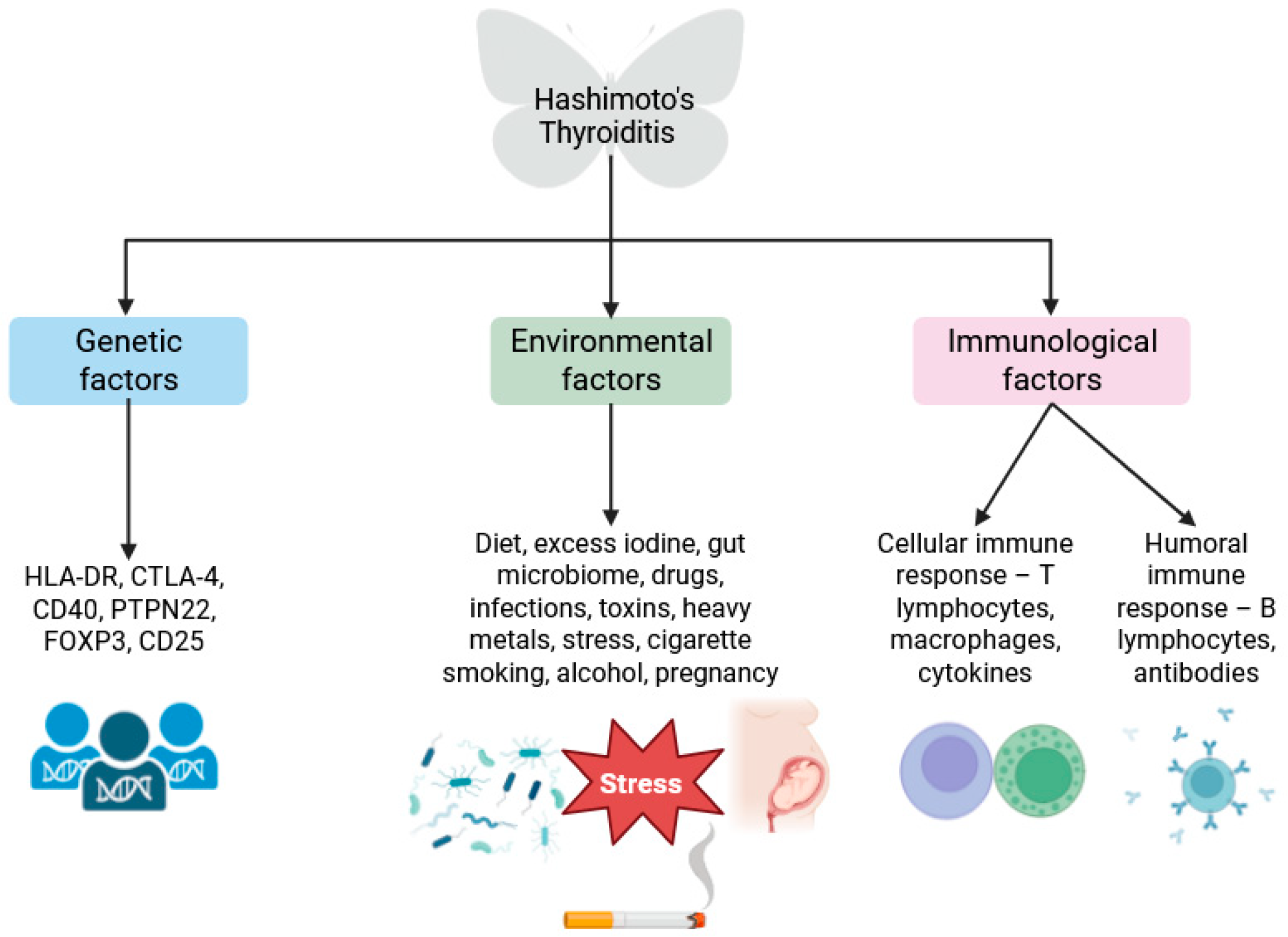 Hashimoto’s Thyroiditis (HT) also known as chronic lymphocytic thyroiditis is one of the most common autoimmune diseases in the world. It affects approximately 5% of the population, and the number of cases is constantly growing, especially in developed Western countries [1]. The etiology of the disease is complex. The disease is 7–10 times more common in women than in men, with the highest incidence occurring between the ages of 30 and 60 [2,3]. There are many genetic, environmental, and immunological factors that increase the risk of HT. Polymorphisms of genes contributing to the loss of immune tolerance have been discovered, such as: human leukocyte antigens (HLA-DR), cytotoxic T-cell antigen-4 (CTLA-4), cell differentiation antigen 25 (CD25), cell differentiation antigen 40 (CD40), non-receptor tyrosine phosphatase type 22 (PTPN22) and forkhead transcription protein P3 (FOXP3) [4]. Environmental determinants influencing the onset of Hashimoto’s Thyroiditis include smoking, infections, medications, toxins, alcohol, stress, and pregnancy [5]. Nutrition and gut microbiota are other important factors that modulate the immune response, affect nutrient absorption, and epigenetic mechanisms regulating the synthesis and metabolism of thyroid hormones [6].
