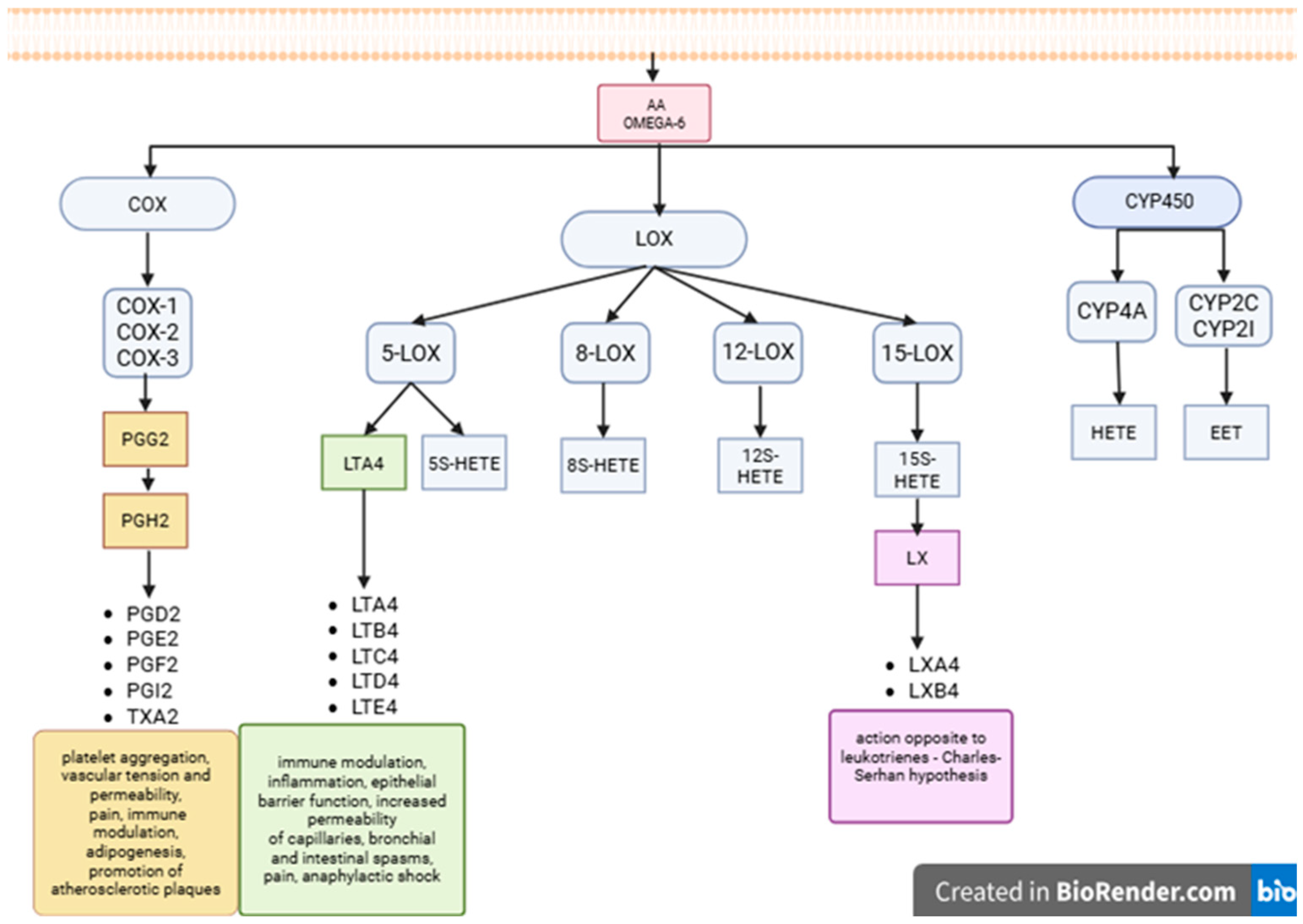 Eicosanoids are derivatives of polyunsaturated fatty acids, including arachidonic acid. These lipid signaling mediators are involved in physiological and pathological processes. They are responsible for cellular metabolism and apoptosis [24]. They also play a crucial role in modulating the immune system, controlling inflammatory processes through chemotaxis and leukocyte activation, fever, pain, blood vessel permeability and tension, as well as platelet aggregation [25]. Arachidonic acid is a precursor of dienes with high biological activity that modify the immune response [26]. The synthesis of lipid mediators is initiated by the activation of phospholipase A2 (PLA2), which responds to various stimuli, including inflammatory stimuli. With its help, arachidonic acid bound to the cell membrane is released from phospholipids into the cytoplasm [27]. It is then converted into potent inflammatory mediators such as prostaglandins (PG), leukotrienes (LT), thromboxanes (TX), and hydroxyeicosatetraenoic acids (HETEs) [28]. Lipid mediators can be formed not only from AA, but also from LA, and include hydroxyoctadecadienoic acids (HODE) [29]. Eicosanoids are formed as a result of the metabolism of arachidonic acid through three main pathways involving cyclooxygenase (COX), lipoxygenase (LOX), and cytochrome P450 (CYP) enzymes [30]. The first pathway- COX-1, COX-2, and COX-3—leads to the formation of prostanoids—prostaglandins H2, E2, D2 and F2 (PGH2, PGE2, PGD2, PGF2), prostacyclins (PGI2), and thromboxane A2 (TXA2)—as a result of the conversion of AA to prostaglandin G2 (PGG2) and then PGH2 [31]. In the second pathway—lipoxygenase pathway, which is currently used for therapeutic purposes, the following can be distinguished: 5-LOX, 8-LOX, 12-LOX, and 15-LOX, which initiate the production of leukotrienes A4, B4, C4 and E4 (LTA4, LTB4, LTC4, LTD4, LTE4), lipoxins A4 and B4 (LXA4, LXB4), and 5S-, 8S-, 12S-, 15S-hydroxyeicosatetraenoic acids (5S-HETE, 8S-HETE, 12S-HETE, 15S-HETE) [32]. Oxidation by 5-hydroxyecosanoyl dehydrogenase of 5S-HETE acid produced by 5-LOX leads to the production of 5-oxo-eicosatetraenoic acid (5-oxo-ETE) [33]. The third pathway of pro-inflammatory arachidonic acid derivative synthesis is associated with CYP-450 activation and leads to the formation of epoxy eicosatrienoic acids (EETs), such as 5,6-EET, 8,9-EET, 11-12-EET, and 14,15-EET. In contrast, the action of CYP-450 and ω-hydroxylase results in the production of HETE acids (19S- and 20S-HETE) [34]. The arachidonic acid metabolism pathways is summarized on Figure 2.
