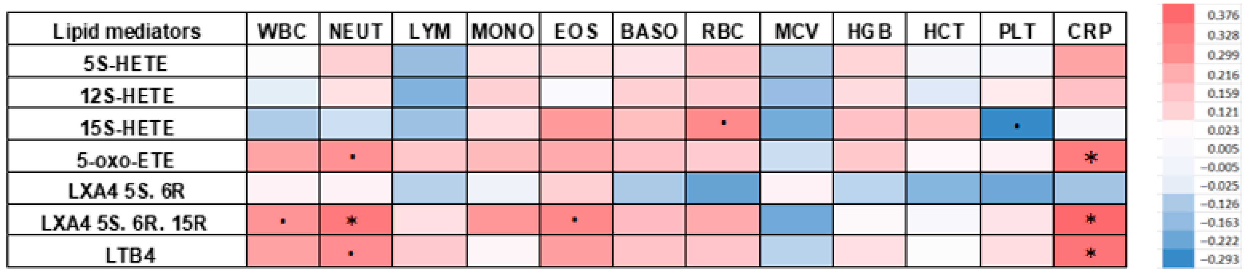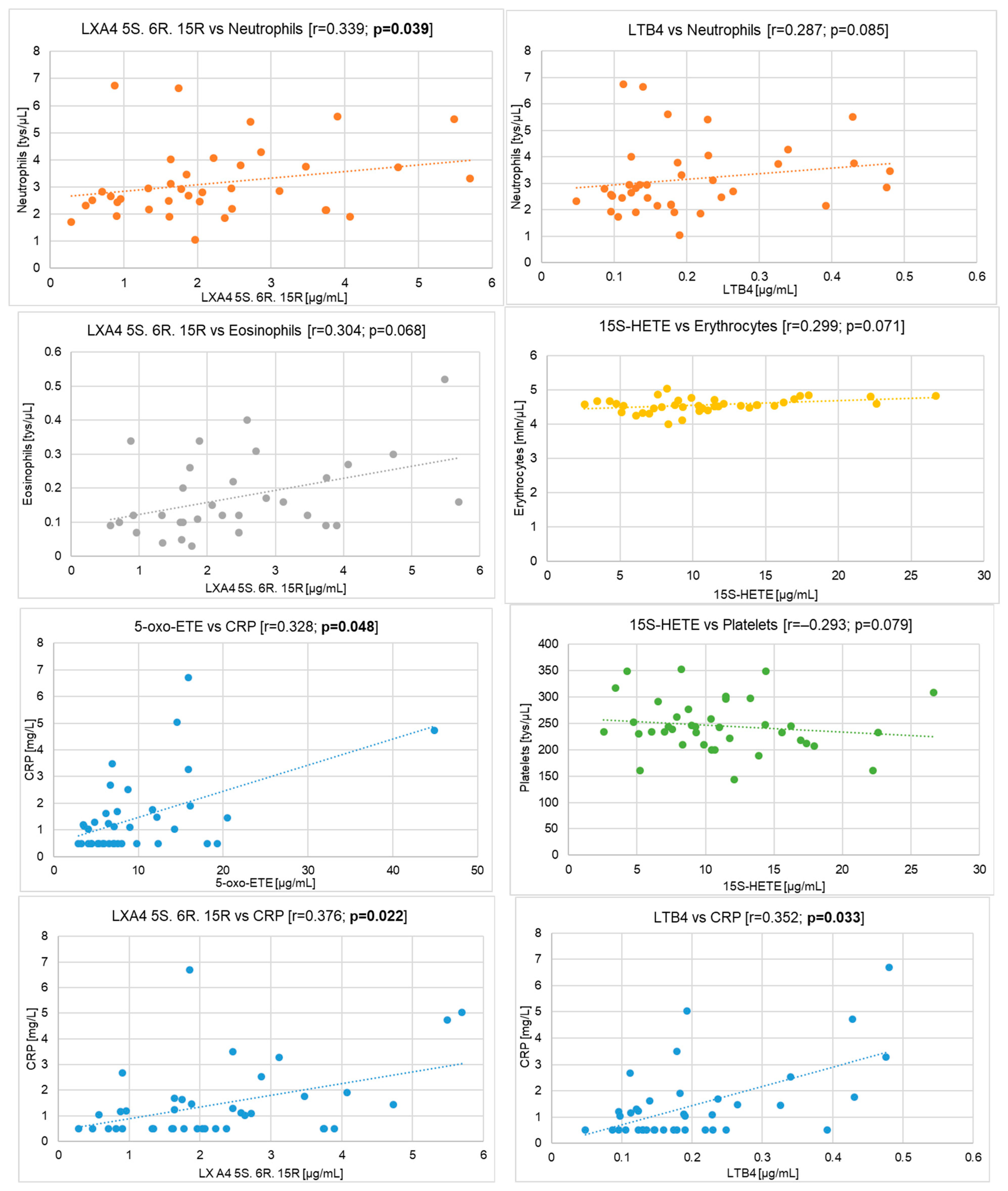 r—Spearman correlation; pp-value; HETE—hydroxyeicosatetraenoic acid; 5–oxo–ETE—5–oxo–eicosatetraenoic acid; LX—lipoxins; LT—leukotrienes; WBC—leukocytes; NEUT—neutrophils; LYM—lymphocytes; MONO—monocytes; EOS—eosinophils; BASO—basophils; RBC—erythrocytes; MCV—mean corpuscular volume; HGB—hemoglobin; HCT—haematocrit; PLT—platelets; CRP—C-reactive protein; Bold font indicates statistically significant correlation (p < 0.05).