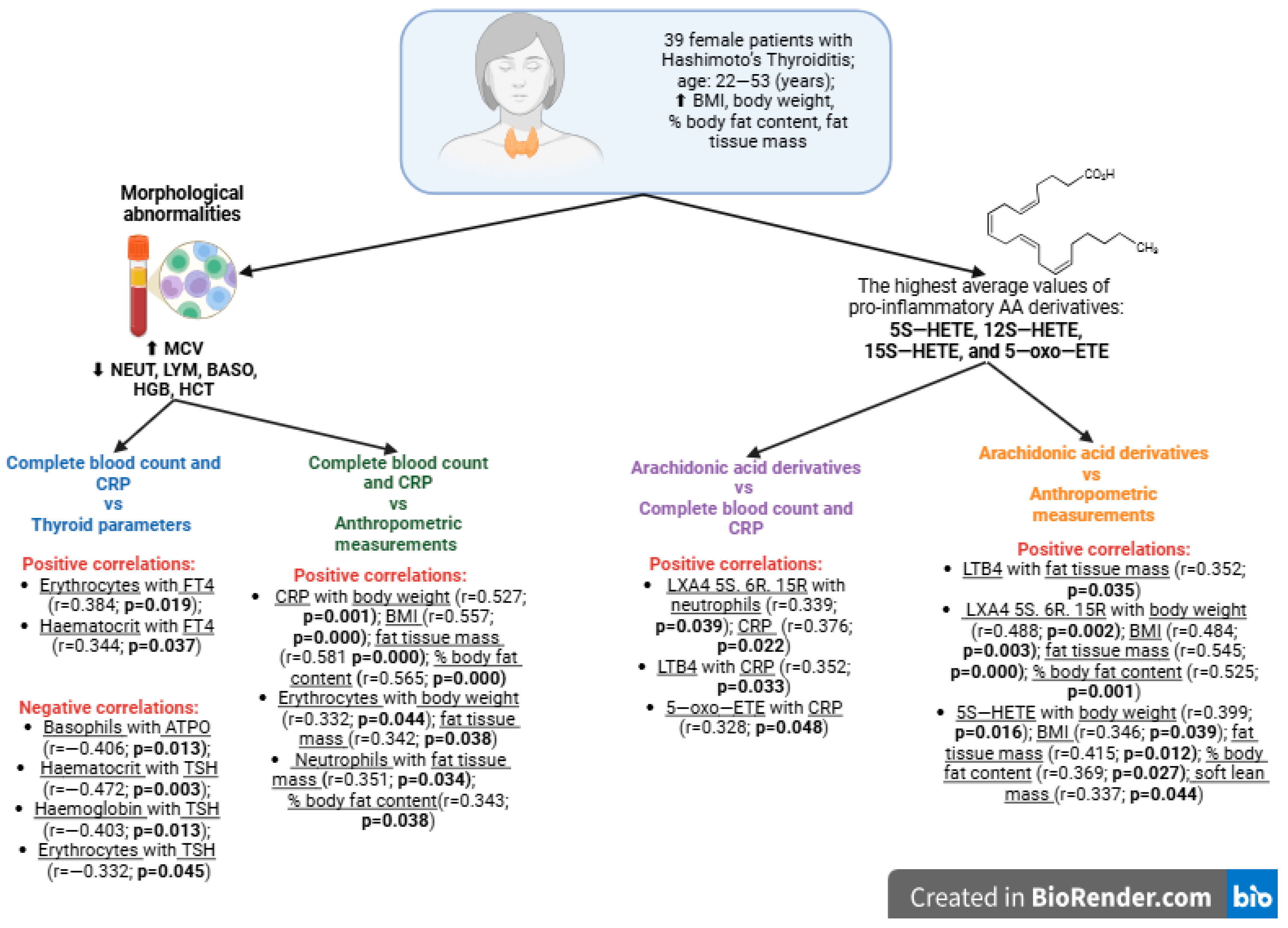 Figure 6. Summary of the study results. BMI—body mass index; MCV—mean corpuscular volume; NEUT—neutrophils; LYM—lymphocytes; BASO—basophils; HGB—hemoglobin; HCT—haematocrit; CRP—C-reactive protein; FT4—free thyroxine; r—Spearman correlation; pp-value; ATPO—anti-thyroid peroxidase antibodies; TSH—thyroid-stimulating hormone; HETE—hydroxyeicosatetraenoic acid; 5–oxo–ETE—5–oxo–eicosatetraenoic acid; LX—lipoxins; LT—leukotrienes; ⬆—increase; ⬇—decrease; Bold font indicates statistically significant correlation (p < 0.05); Created in BioRender. Wrońska K (2025); https://app.biorender.com/illustrations/65f084c6e21815e3714c195e.