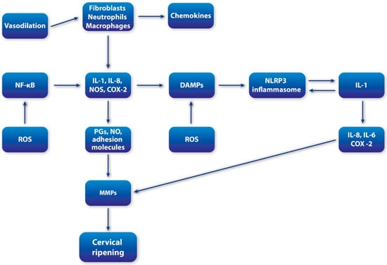 The functional importance of these recruited cells lies in their capacity to secrete a broad repertoire of soluble mediators that directly alter tissue architecture and enhance ongoing inflammation. Macrophages, neutrophils and fibroblasts degranulate to release MMPs, which degrade collagen and other ECM components, thereby weakening cervical tensile strength. Simultaneously, they generate high levels of pro-inflammatory cytokines such as IL-1, IL-6 and IL-8, tumor necrosis factor (TNF) along with prostaglandins, NO and reactive oxygen species (ROS), creating a potent feed-forward loop that accelerates inflammation and tissue remodeling [9,46,51,52,53].