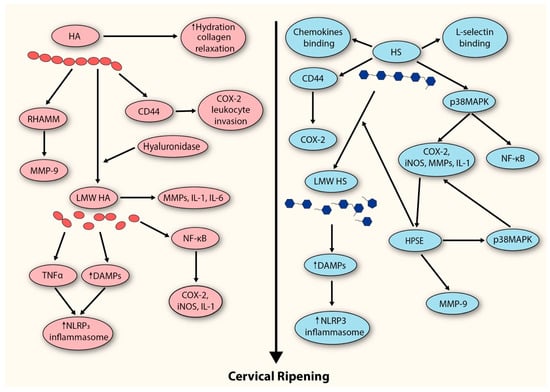 The cervix of a pregnant woman differs substantially from that of a non-pregnant one [189]. During pregnancy, profound qualitative changes occur in the composition of the cervical ECM, with a growing predominance of HS and HA [190]. Therefore, it seems reasonable to assume that both HS and HA, together with infiltrating inflammatory cells, represent the main executors of the cervical ripening process. HA, particularly its low-molecular-weight fragments generated by hyaluronidase, contributes not only to tissue hydration and viscoelasticity but also to leukocyte recruitment via CD44 and RHAMM activation [137,140,149]. This interaction enhances COX-2 and MMPs activity, thereby promoting collagen disorganization and local PG synthesis [149]. HS complements these actions by stabilizing chemokine gradients, protecting cytokines from degradation, and directly activating pro-inflammatory signaling pathways, including p38MAPK and NF-κB, which converge on COX-2, MMP-9, cytokines and leukocyte adhesion molecules [152,153]. Importantly, enzymatic cleavage of HA and HS by hyaluronidase and heparanase generates bioactive fragments that act as DAMPs, further amplifying inflammasome activation and sustaining inflammation [97]. Together, these processes position HA and HS not only as structural ECM components but also as active modulators of the inflammatory cascade that underpins cervical ripening.