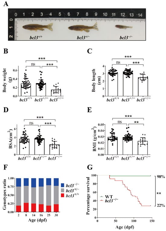 Phenotypes of bcl3−/− zebrafish. (A) Representative images of bcl3+/+, bcl3+/−, and bcl3−/− zebrafish at 4 months old. (B) Body weight, (C) body length, (D) body surface area (BSA), and (E) body mass index (BMI) of bcl3+/+, bcl3+/−, and bcl3−/− zebrafish. BSA was defined by: BSA (cm2) = 8.46 × (body weight (g))0.66; BMI was calculated as body weight (g) divided by body length square (cm2). Body length data were normally distributed and analyzed using one-way ANOVA followed by Tukey’s post hoc test; whereas body weight data, BSA, and BMI values did not meet normality assumptions and were analyzed using the Kruskal–Wallis test with Holm-corrected Mann–Whitney U post hoc comparisons. (F) Genotype ratio of bcl3+/+, bcl3+/−, and bcl3−/− larvae at indicated dpf. At each time point, 48 larvae were genotyped. (G) Survival curves of zebrafish WT and bcl3−/− from 35 to 150 dpf, analyzed using the log-rank (Mantel–Cox) test. *** p < 0.001, ** p < 0.01, ns indicates not significant. Error bars represent standard deviation (SD).