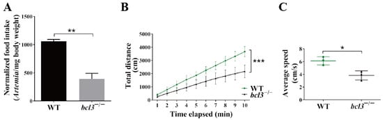 In addition, zebrafish motility was also assessed by tracking their swimming behavior. The bcl3−/− zebrafish at 4 months old were also found to exhibit significantly reduced motility, as evidenced by reduced swimming distances as well as swimming speeds (Figure 2B,C). Both the reduced food intake and motility observed in bcl3−/− fish likely contributed to their growth retardation and low survival.