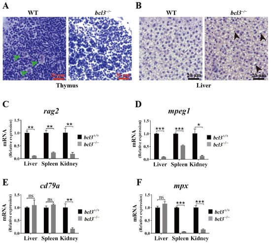 Bcl3 was known to function together with the NF-κB family of transcription factors, a key regulator of immune responses. Therefore, histological analyses were performed on the key immune organs, the thymus and liver, in zebrafish at 4 months old. Hematoxylin and eosin (H&E) staining revealed the absence of Hassall bodies in the thymus of bcl3−/− zebrafish (Figure 3A). Hassall’s functions include the removal of apoptotic thymocytes, the maturation of developing thymocytes, and the direction of dendritic cells to induce CD4+CD25+ regulatory T cells in the human thymus [33]. Additionally, nuclear displacement and pyknosis of hepatocytes were observed in the liver of bcl3−/− zebrafish (Figure 3B), indicating structural disruption consistent with impaired immune or metabolic activities. To further investigate the impact of bcl3 deficiency on immune function, the mRNA level of immune cell marker genes was checked by RT-qPCR. The expression of T cell marker rag2 and macrophage marker mpeg1 was found to be significantly lower in the liver, spleen, and kidney of bcl3−/− zebrafish (Figure 3C,D); the expression of B cell marker cd79a was significantly reduced in the kidney (Figure 3E); and the expression of neutrophil marker mpx was significantly reduced in both the spleen and kidney (Figure 3F). The combination of histological abnormalities in immune organs and the reduced expression of immune cell markers strongly suggested that bcl3 deficiency compromises the immune organ integrity and impairs immune cell development.