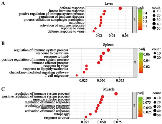 Transcriptomic analyses reveal systemic immune activation in bcl3−/− zebrafish. Gene Ontology (GO) enrichment maps showing upregulated biological processes in the (A) liver, (B) spleen, and (C) muscle of bcl3−/− zebrafish compared with bcl3+/+ controls. The y-axis lists pathway terms, and the x-axis represents gene ratios. Circle size indicates the number of genes, while color intensity denotes the adjusted p-value (padj).