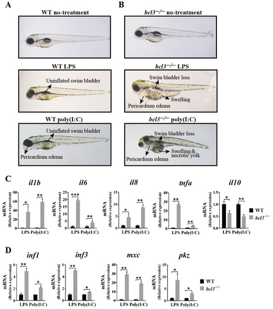 Immune responses upon LPS and poly(I:C) stimulation in bcl3−/− larvae. Representative morphology of (A) WT and (B) bcl3−/− larvae under untreated condition or at 24 h upon LPS or poly(I:C) injection. Relative mRNA expression of (C) pro-inflammatory genes il1b, il6, il8, and tnfa and anti-inflammatory gene il10, and (D) antiviral genes ifn1, ifn3, mxc, and pkz in WT and bcl3−/− larvae 24 h upon LPS or poly(I:C) injection. The data was analyzed from three independent experiments performed in triplicate. *** p < 0.001, ** p < 0.01, * p < 0.05 (t-test). Error bars represent SD.