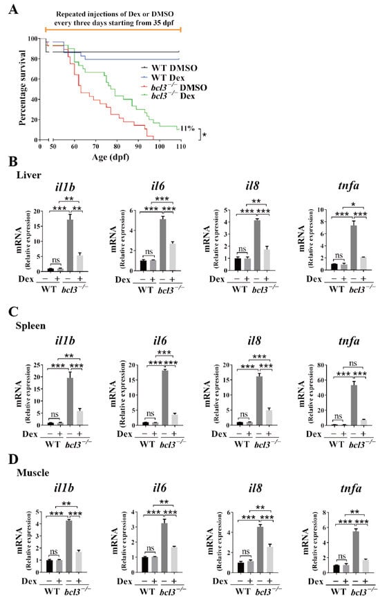 We further assessed the effects of Dex treatment on the survival of adult bcl3−/− zebrafish. At 35 dpf, WT and bcl3−/− zebrafish were injected with Dex every three days. All bcl3−/− zebrafish in the DMSO treated control group died at 98 dpf; while those bcl3−/− fish in the Dex treatment group had an 11% survival rate until 138 dpf (Figure 7A). The treatment of Dex partially rescued the survival rate of adult bcl3−/− zebrafish compared to the DMSO control. bcl3−/− zebrafish were also sampled at 87 dpf, and Dex treatment was found to have no effects on either the body morphology, or the reduced body length and weight characteristic of the fish (Figure S6). In the liver, spleen, and muscle of those survived bcl3−/− zebrafish upon Dex treatment >100 dpf, pro-inflammatory cytokines il1b, il6, il8, and tnfa were all significantly downregulated compared to the control fish treated with DMSO; however, the expression levels of these genes were still higher than those in the WT zebrafish (Figure 7B,D). In this experiment, the treatment of Dex started at 35 dpf which coincided with the maturation of adaptive immunity in zebrafish (~4–6 weeks post-fertilization) [34,35,36,39]. At this stage, the innate and adaptive immune systems increasingly interact; therefore, the anti-inflammatory interventions might not be able to fully suppress the established inflammatory circuits. Collectively, these results demonstrated that Dex treatment successfully attenuates hyperinflammation and improves survival of bcl3−/− zebrafish. However, Dex treatment could not restore growth impairments completely in the adult fish which suggested that Bcl3 might have additional physiological functions other than immune regulation. Further investigation into the precise mechanism underlying Bcl3-dependent immune and developmental regulation is needed in the future.