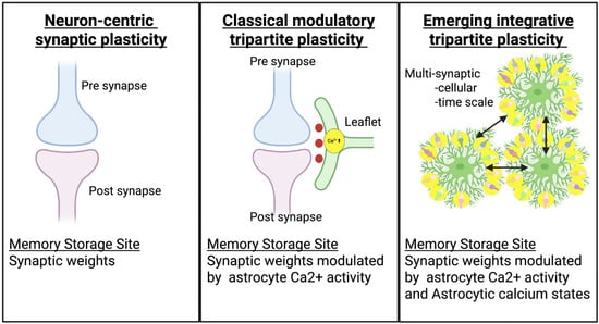 In the neuron-centric model, plasticity arises from pre- and postsynaptic mechanisms such as NMDA receptor activation and AMPAR trafficking, with memory stored at individual neuronal synapses. In the classical tripartite model, plasticity involves coordinated activity among presynaptic terminals, postsynaptic neurons, and astrocytic leaflets, where astrocytic Ca2+ signaling and gliotransmission modulate synaptic strength and timing. In the emerging integrative model, astrocytes contribute to plasticity through multi-synaptic and cellular-scale calcium states that integrate network activity over time, making astrocyte microdomains an additional site for distributed memory encoding and storage within neural circuits.