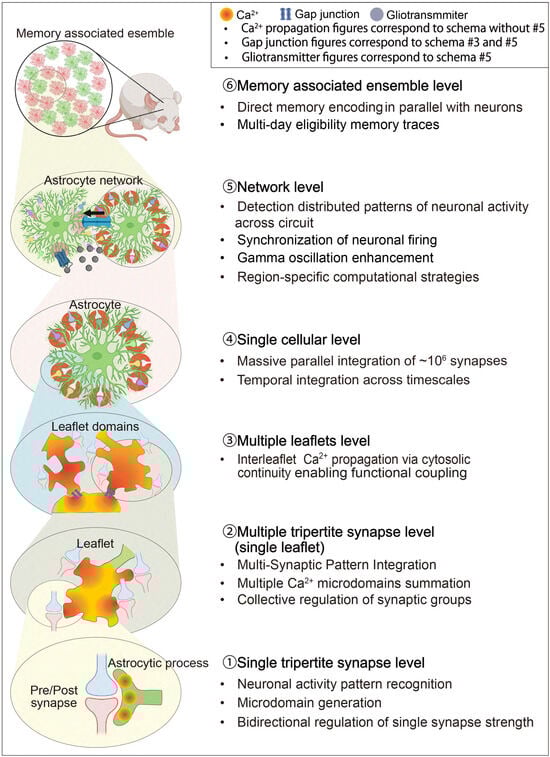 Schematic illustration of the hierarchical organization of astrocyte signaling and integration across spatial and functional scales. At the single tripartite synapse level, individual tripartite synapses are modulated by localized Ca2+ transients and astrocytic read–write mechanisms. At the multi-synaptic level, a single astrocytic leaflet interacts with up to ten synapses, integrating local inputs into coherent microcircuit modulation. At the multi-leaflet level, neighboring leaflets form gap–junction-interconnected domains that coordinate calcium activity across a single astrocyte territory, thereby supporting domain-wide information processing. At the single-astrocyte level, one protoplasmic astrocyte contacts up to 106 synapses, integrating excitatory and inhibitory inputs through intracellular calcium signaling and metabolic coupling. At the network level, intercellular communication via Ca2+ waves through gap junction coupling, and gliotransmitter release synchronizes astrocytic and neuronal ensembles across brain regions. Finally, at the ensemble level, distributed astrocyte populations form functional networks that participate in learning, memory processing, and state-dependent coordination of neural circuits. Adapted from [14].