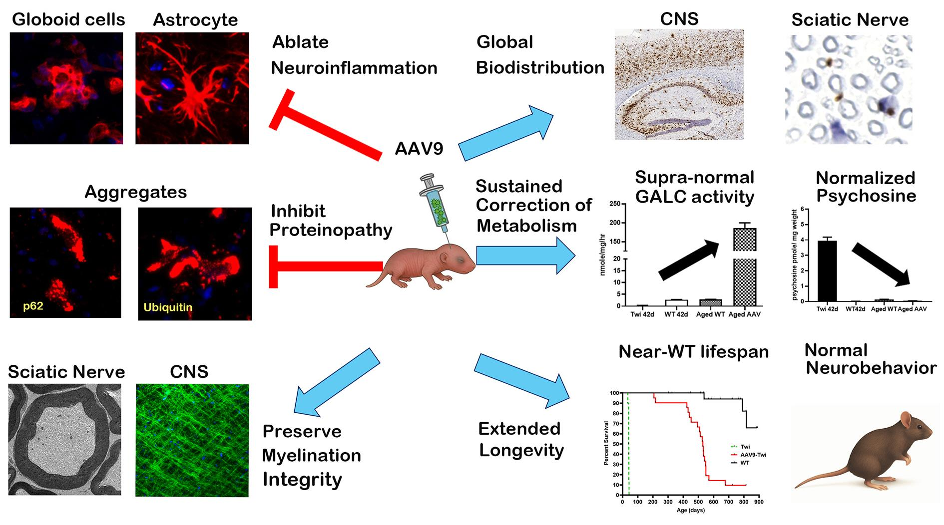 - A single, region-specific intracranial dose of AAV9-GALC achieves widespread CNS-PNS biodistribution, sustained supraphysiological GALC activity, and complete lifelong psychosine normalization in Twitcher mice.