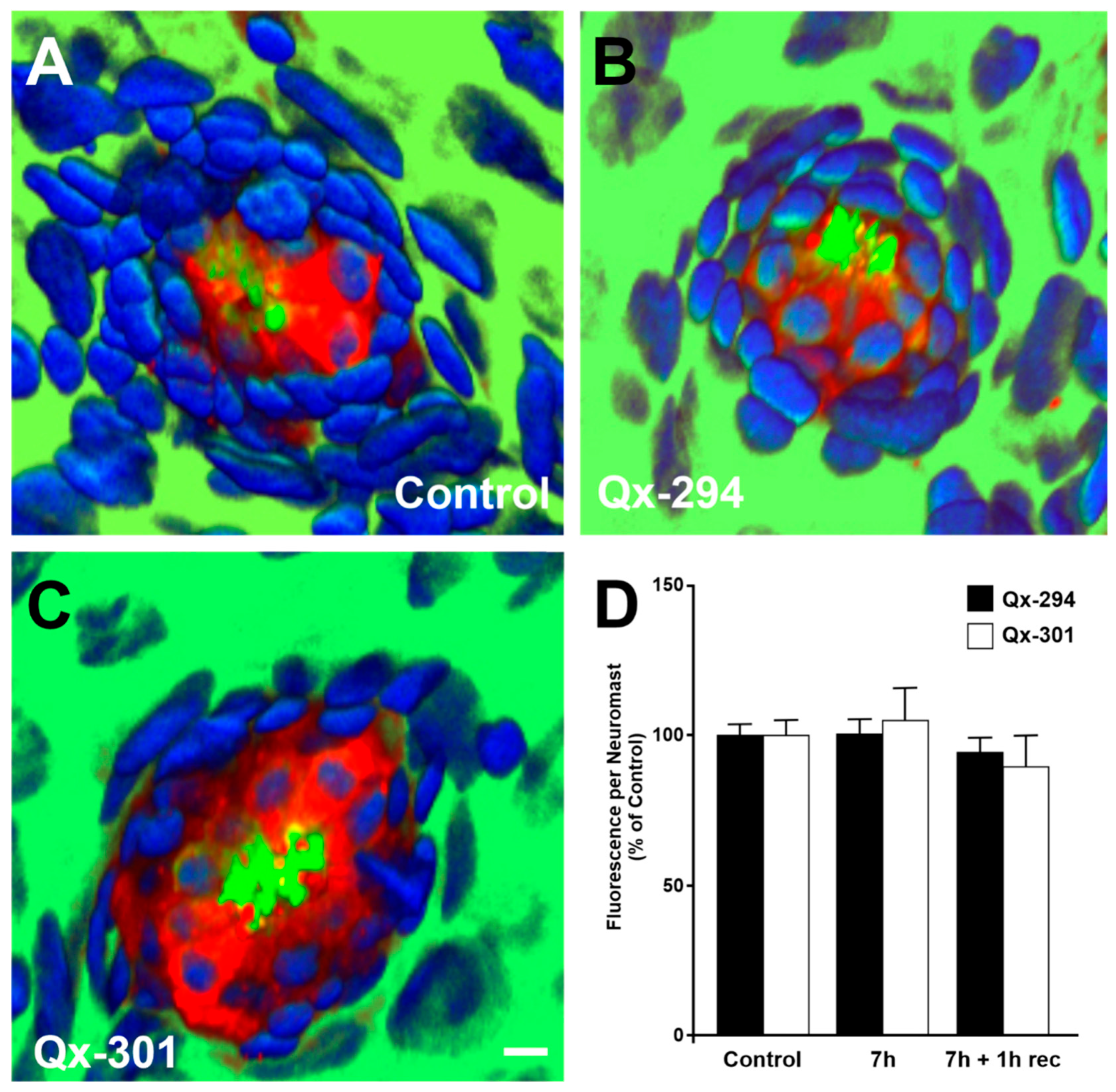 3.3. Increasing Concentrations of Qx-294 and Qx-301 on Zebrafish Neuromasts Do Not Affect the Integrity or Survival of Neuromast HCs In Vivo