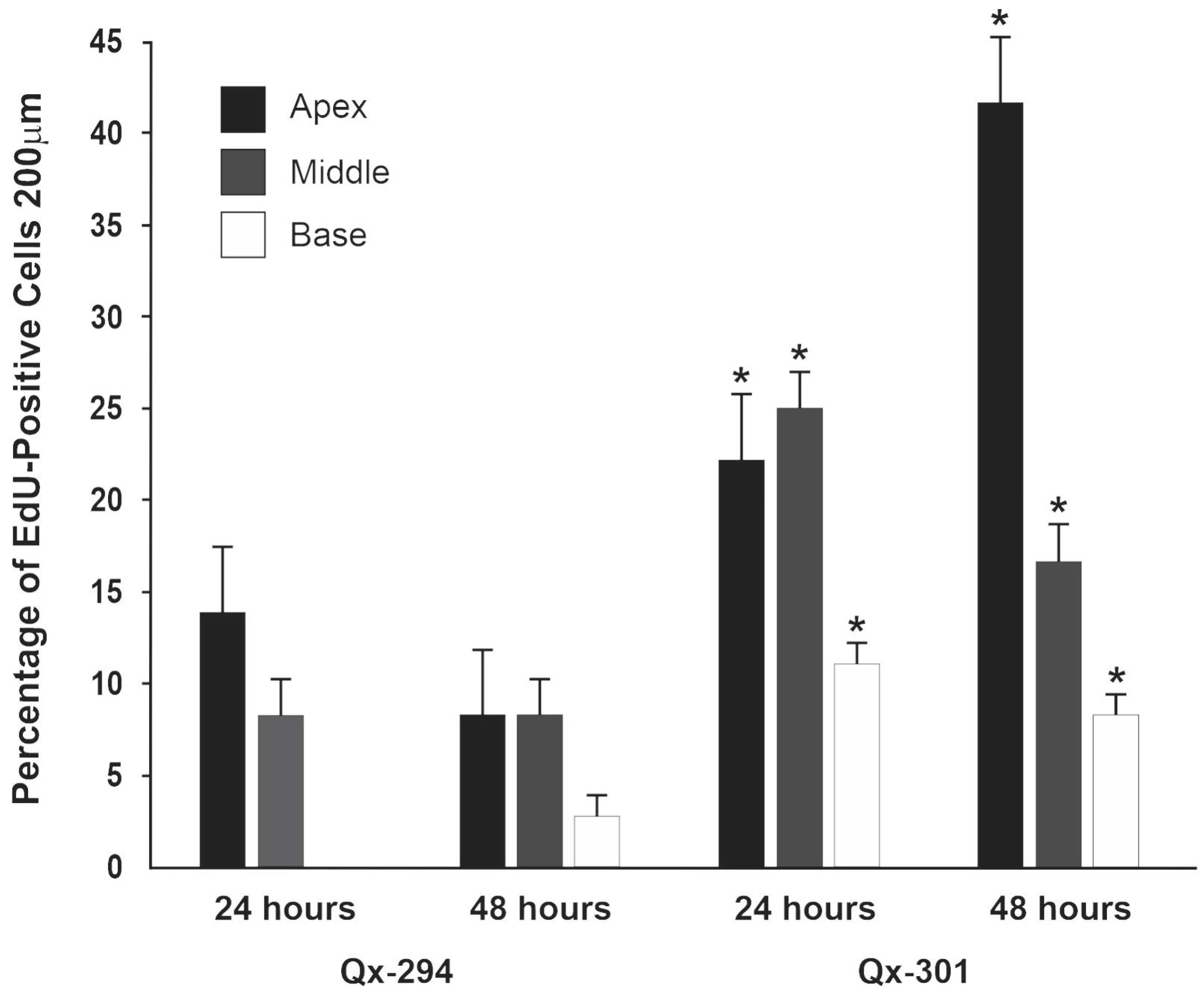 3.4. Qx-294 and Qx-301 Treatments Lead to Unscheduled Proliferation and Supernumerary Cells on Zebrafish Neuromasts and Mouse Cochlear Explants