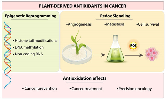 Plant-derived antioxidants play dual roles in cancer by modulating epigenetic and redox pathways, as illustrated schematically.