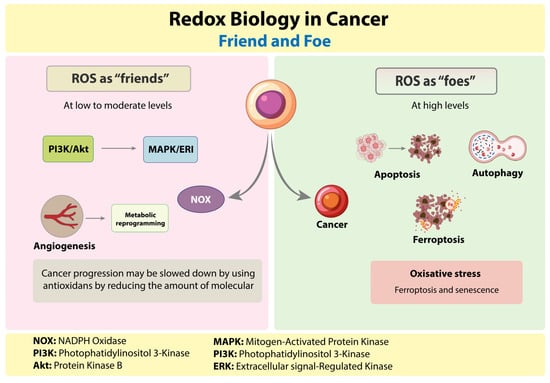 ROS plays a dual role in cancer. ROS, at low to moderate levels, promote survival, angiogenesis, and metabolic reprogramming via PI3K/Akt and MAPK/ERK signaling. ROS at high concentrations cause oxidative stress, which leads to apoptosis, autophagy, and ferroptosis.