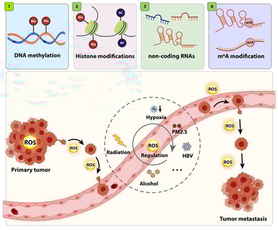 Reactive oxygen species have a significant impact on the epigenetic landscape [78]. ROS have a significant impact on gene expression patterns without changing the underlying DNA sequence by causing direct chemical modifications of DNA and histones or indirectly regulating epigenetic enzymes. These epigenetic changes not only promote tumor initiation and progression, but also maintain redox imbalance, resulting in a self-sustaining oncogenic environment [78].