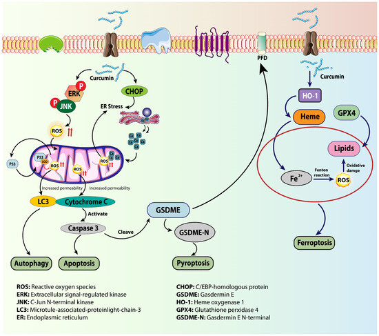 Diagrammatic representation of curcumin regulates the pathways leading to cell death. Curcumin causes ER stress and activates JNK/ERK signaling, which leads to the buildup of ROS and mitochondrial dysfunction. Cytochrome C and caspase-3 then trigger autophagy and apoptosis. It alters HO-1/GPX4 signaling to affect ferroptosis and lipid peroxidation, whereas pyroptosis is caused by caspase-3-mediated GSDME cleavage. These interrelated processes demonstrate curcumin’s complex regulation of oxidative stress-induced cell fate. Reproduced from Hu et al. [117]. Licensed under Creative Commons Attribution (CC BY 4.0).