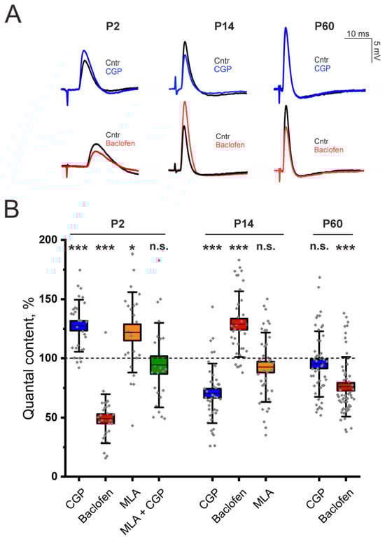 Figure 1. Involvement of GABAB–R in the regulation of ACh at LAL NMJs in neonatal (P2), young (P14) and adult (P60) mice. (A)—Representative EPPs recorded at the NMJs in the control (Cntr) and after the application of the GABAB–R blocker CGP 55845 (CGP, 5 μM) or the GABAB–R agonist baclofen (10 μM) at different stages of ontogenesis. (B)—Effects of GABAB–R ligands (CGP 55845 or baclofen) and an α7 nAChR antagonist (MLA, 10 nM) on the QC of EPPs upon 0.5 Hz motor nerve stimulation. The value of the QC in the control was taken as 100%. The data are presented as box plots: gray diamonds, relative changes in individual experiments; horizontal lines, M; whiskers, SD; boxes, SEM for the entire series of experiments (n = 28–56). n.s.—not significant, * p < 0.05 and *** p < 0.001—Mann–Whitney U test between the control and individual chemical groups.