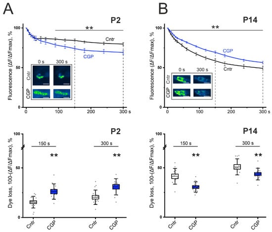 Figure 3. Effect of the GABAB-R blocker CGP 55845 (5 μM) on exocytotic dye release from FM1-43-preloaded motor nerves of the LAL of newborn (P2, panel (A)) and young (P14, panel (B)) mice. (Top)—kinetics of exocytotic FM 1-43 dye release from motor nerve terminals in control (Cntr, black) and CGP-treated nerve-muscle preparations (CGP, blue). The inset shows typical fluorescence images of NMJs before the onset (0) and at 300 s of stimulation in the control and in the presence of CGP 55845. Scale bars, 15 µm. (Bottom)—the portion of dye fluorescence loss during 150 s and 300 s of stimulation at 30 Hz in control (Cntr; n = 12–17) and CGP-treated nerve terminals (n = 13–14). ** p < 0.01 vs. control values.