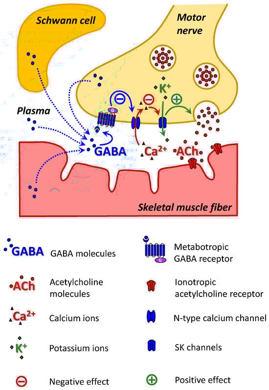 6. Malomouzh, A.I.; Petrov, K.A.; Nurullin, L.F.; Nikolsky, E.E. Metabotropic GABAB receptors mediate GABA inhibition of acetylcholine release in the rat neuromuscular junction. J. Neurochem. 2015, 135, 1149–1160. [Google Scholar] [CrossRef]