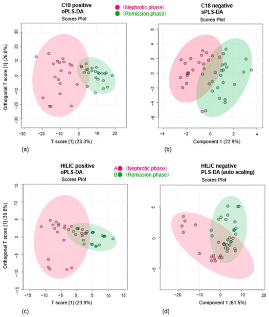 Multivariate analyses distinguishing the nephrotic and remission phases of pediatric ISSNS. (a) Orthogonal partial least squares discriminant analysis (oPLS-DA) using a C18 column in positive ion mode; (b) Sparse partial least squares discriminant analysis (sPLS-DA) using a C18 column in negative ion mode; (c) Orthogonal partial least squares discriminant analysis (oPLS-DA) using a HILIC column in positive ion mode; (d) Partial least squares discriminant analysis (PLS-DA) using a HILIC column in negative ion mode. Score plots for all analyses are shown for comparison between nephrotic and remission phases. Data points for the nephrotic phase are shown in red, and those for the remission phase are shown in green.