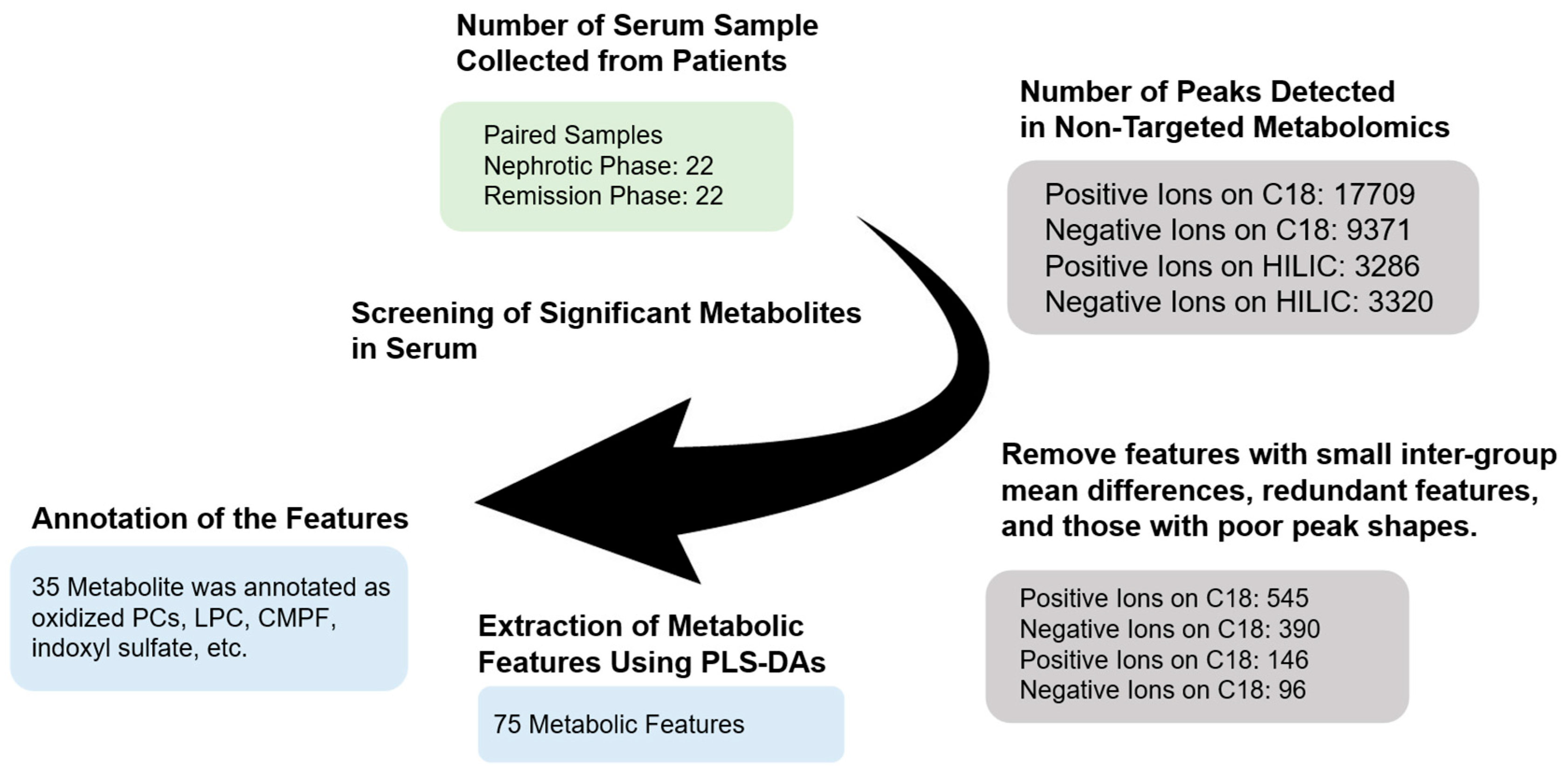 - Hu, L.; Lin, L.; Huang, G.; Xie, Y.; Peng, Z.; Liu, F.; Bai, G.; Li, W.; Gao, L.; Wang, Y.; et al. Metabolomic Profiles in Serum and Urine Uncover Novel Biomarkers in Children with Nephrotic Syndrome. Eur. J. Clin. Investig. 2023, 53, e13978. [Google Scholar] [CrossRef]