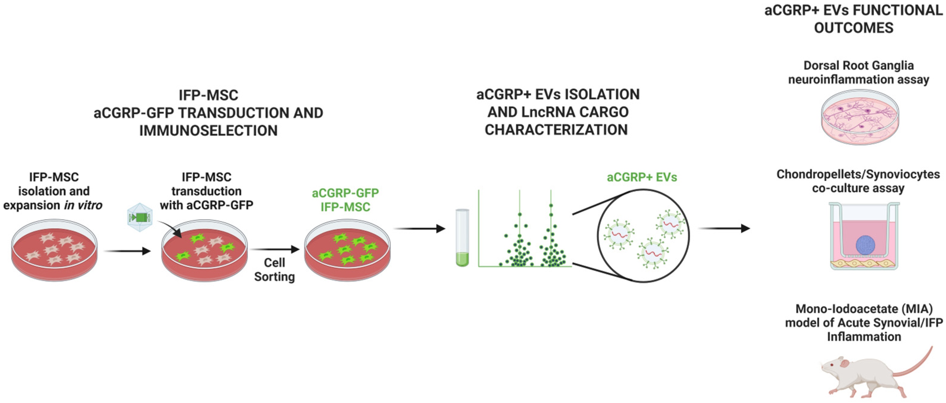 Liebmann, K.; Castillo, M.; Jergova, S.; Rahimi, B.; Kaplan, L.D.; Best, T.M.; Sagen, J.; Kouroupis, D. Functional Assessment of Genetically Modified Infrapatellar Fat Pad Mesenchymal Stem/Stromal Cell-Derived Extracellular Vesicles (EVs): Potential Implications for Inflammation/Pain Reversal in Osteoarthritis. Cells 2025, 14, 1952. https://doi.org/10.3390/cells14241952