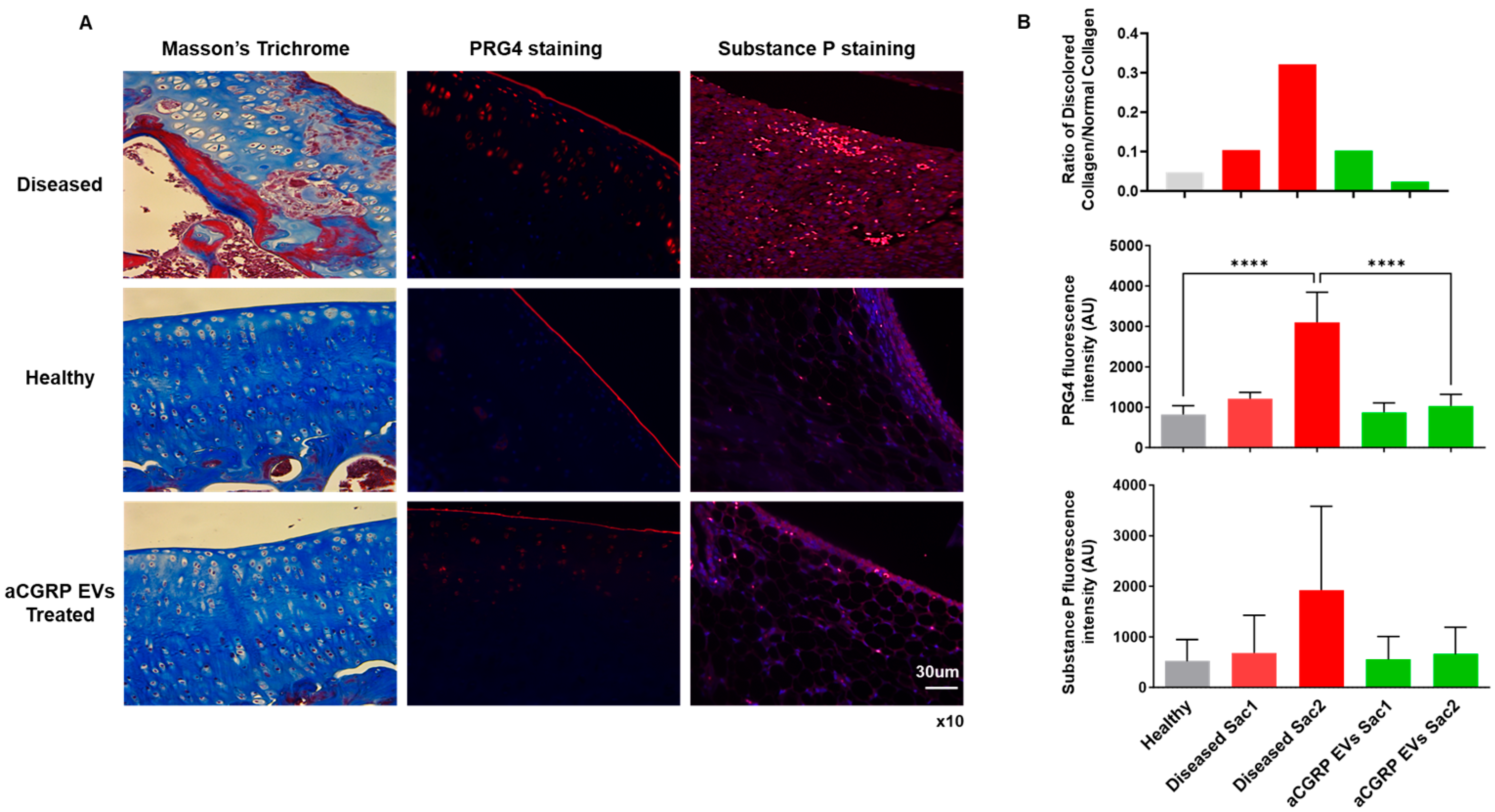 3.5. aCGRP IFP-MSC EV Effects on Cartilage Homeostasis and Pain Signaling Assessed by Histological Evaluation