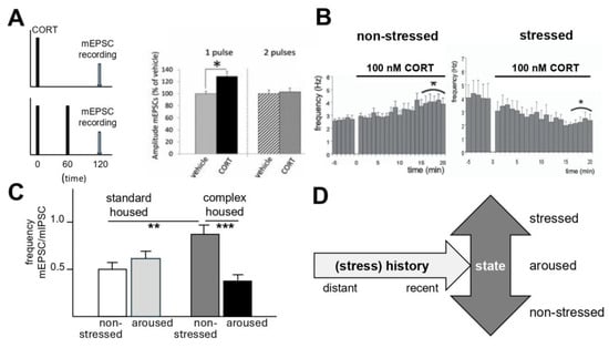Examples of cellular metaplasticity in relation to (earlier) changes in corticosteroid level. (A) Neurons respond (120 min) after a single 20 min pulse of (100 nM) corticosterone (CORT) with an increased amplitude of the miniature excitatory postsynaptic current (mEPSC), which represents the cell’s response to one spontaneously released glutamate-containing synaptic vesicle. If the cell is exposed to a second CORT pulse 60 min after the first, which mimics the normal ultradian rhythm, the mEPSC amplitude remains stable, thus ensuring that the entire range of the cell’s responsivity to incoming information is intact. *: p < 0.01. From ref. [85]. (B) Application of 100 nM CORT increases within 10–15 min the mEPSC frequency of principal basolateral amygdala cells. This enhancement is sustained. If mice are exposed to a restraint stressor and tested >1 h later for their cellular response to 100 nM CORT, basolateral amygdala cells show a decrease in mEPSC frequency. *: p < 0.05. (C) The frequency of mEPSCs relative to that of inhibitory postsynaptic currents (mIPSCs)—which is sometimes used as a proxy for the excitation-inhibition ratio of a cell—is increased in infralimbic prefrontal layer2/3 pyramidal cells of mice exposed to 10 days of complex housing in adulthood relative to standard-housed mice, but only when both groups were tested under non-stressed conditions. By contrast, complex-housed mice that were mildly aroused shortly before slice preparation showed a decreased excitation-inhibition ratio. **: p < 0.01; ***: p < 0.001. From ref. [29]. (D) Collectively, these examples illustrate that the full impact of a recent or distant history of stress (or ultradian CORT pulses) on cellular activity can be best appreciated when tissue is obtained not only from animals under rest but also when they are challenged. (A): Reprinted/adapted with permission from ref. [72], copyright 2014, PNAS; (B): Reprinted/adapted with permission from ref. [29], copyright 2010, PNAS: (C): Reprinted/adapted with permission from ref. [90], copyright 2025, Elsevier.