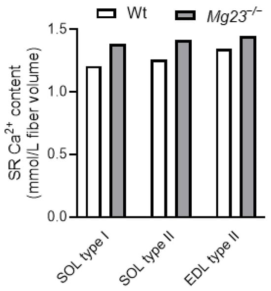 Sarcoplasmic reticulum (SR) Ca2+ content in skeletal muscle fibres of Mitsugumin 23 knockout (Mg23−/−) mice. EDL, extensor digitorum longus; SOL, soleus; Wt, wild type. Adapted from Watanabe et al. (2024) [19].