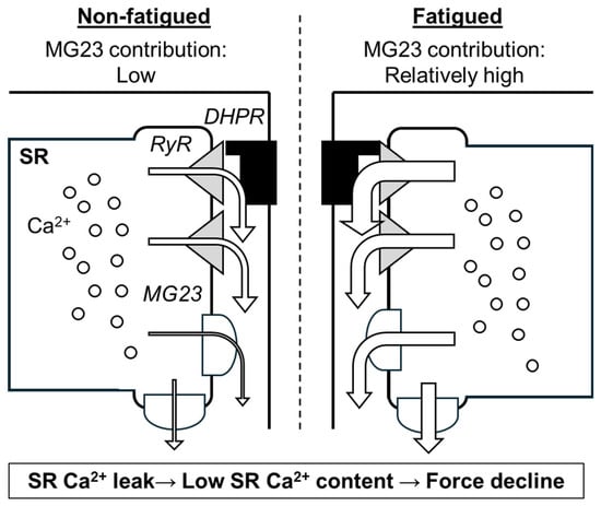 Scheme of predicted contribution of Mitsugumin 23 (MG23) to skeletal muscle fatigue. As shown by arrows, sarcoplasmic reticulum (SR) Ca2+ leak through ryanodine receptor (RyR) and MG23 is thought to occur even under resting condition. During fatigue, RyR-mediated and MG23-mediated Ca2+ leak are enhanced. DHPR, dihydropyridine receptor.