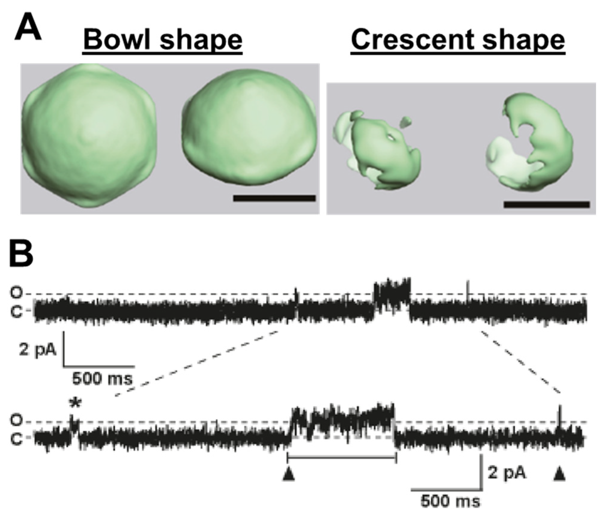- Venturi, E.; Mio, K.; Nishi, M.; Ogura, T.; Moriya, T.; Pitt, S.J.; Okuda, K.; Kakizawa, S.; Sitsapesan, R.; Sato, C.; et al. Mitsugumin 23 forms a massive bowl-shaped assembly and cation-conducting channel. Biochemistry 2011, 50, 2623–2632. [Google Scholar] [CrossRef] [PubMed]