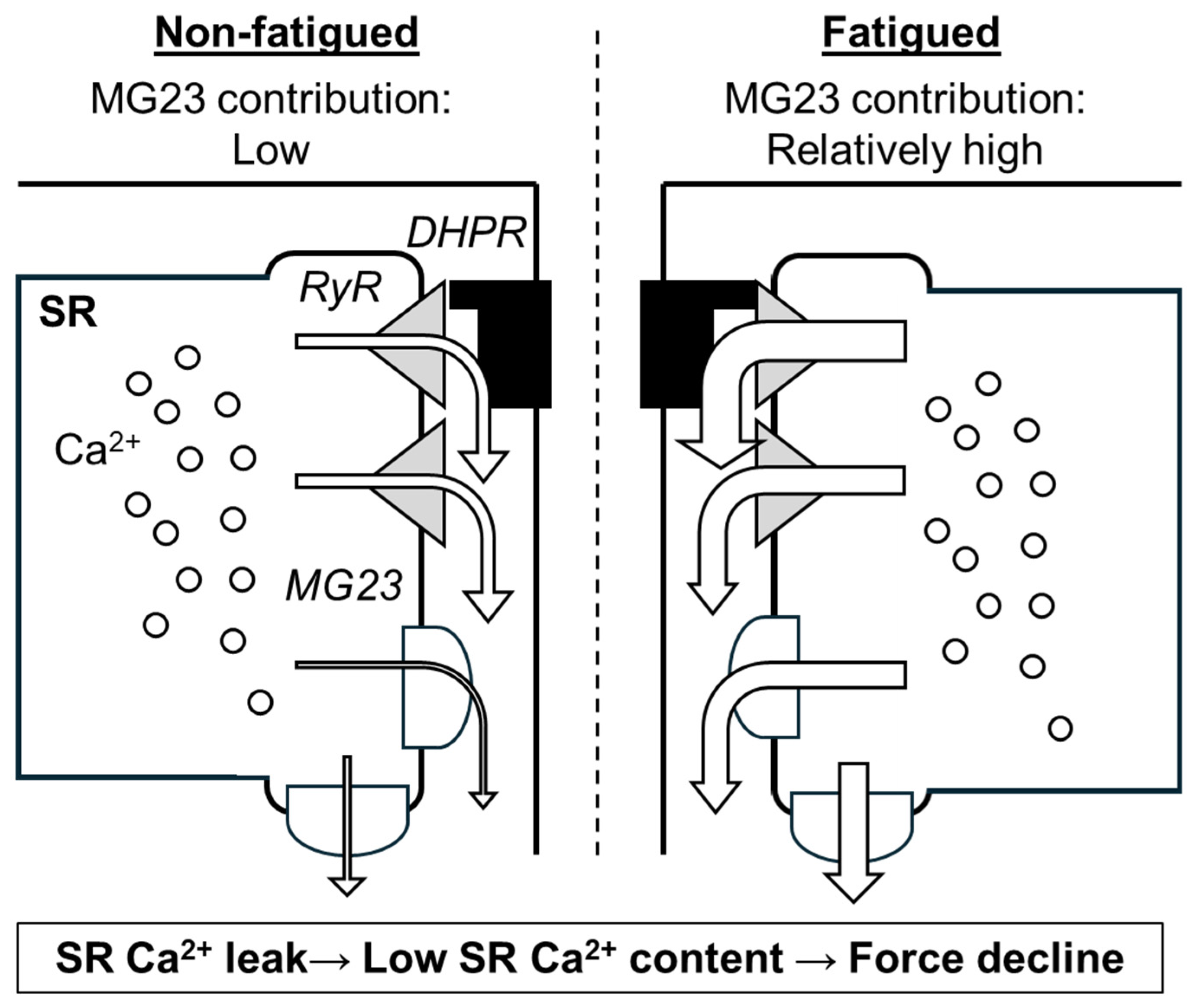 - Ivarsson, N.; Mattsson, C.M.; Cheng, A.J.; Bruton, J.D.; Ekblom, B.; Lanner, J.T.; Westerblad, H. SR Ca2+ leak in skeletal muscle fibers acts as an intracellular signal to increase fatigue resistance. J. Gen. Physiol. 2019, 151, 567–577. [Google Scholar] [CrossRef]